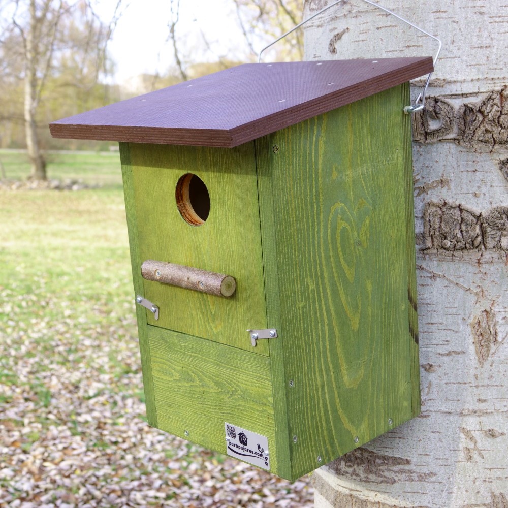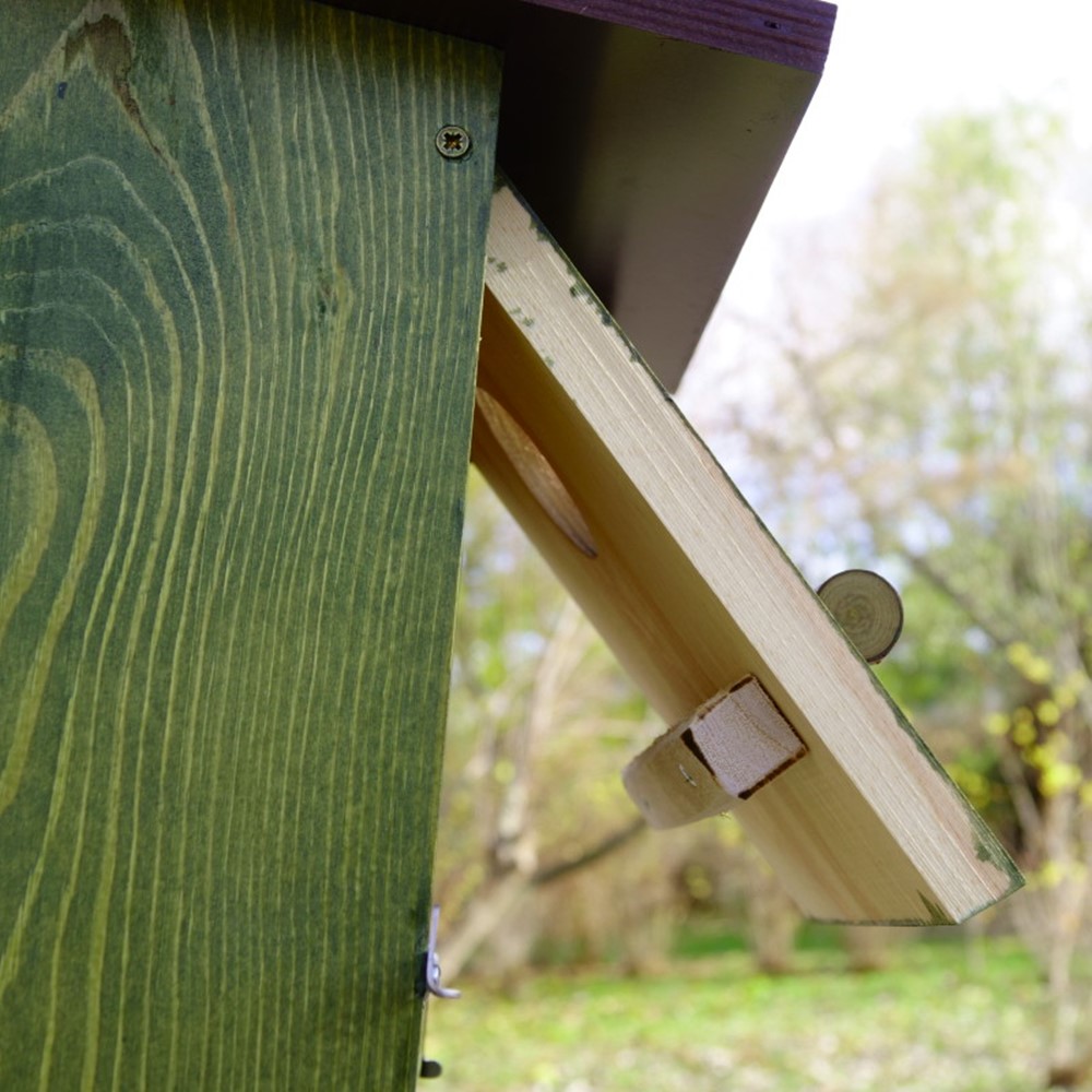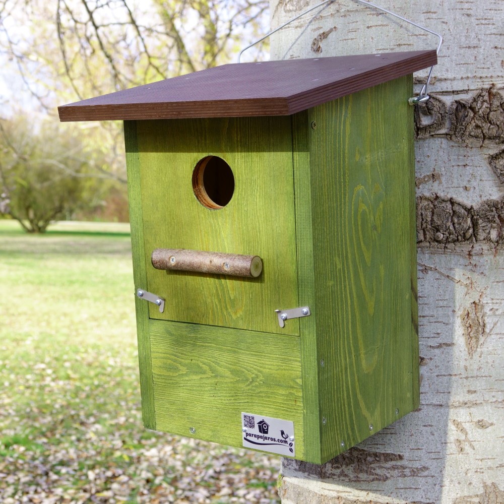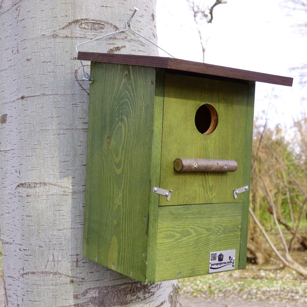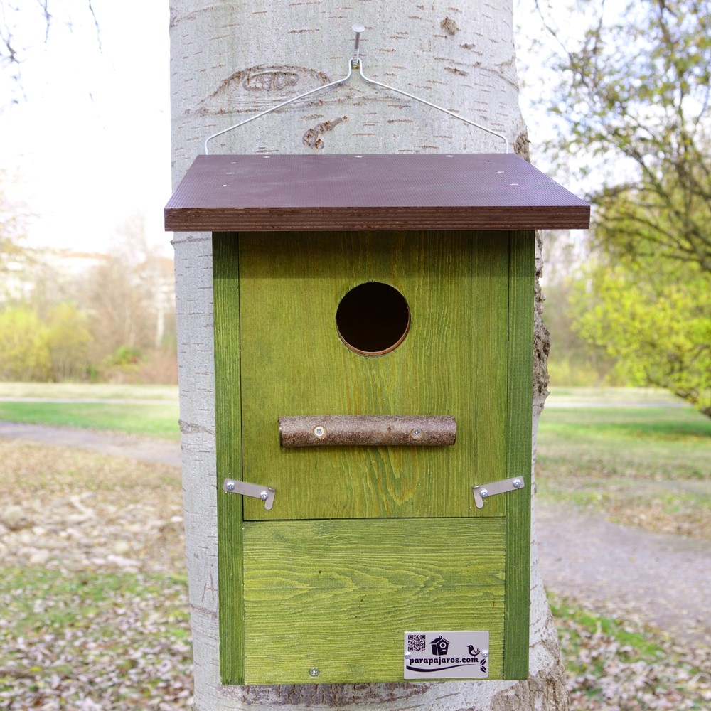 Hecha a mano con tejado de tablero de carrocero, laterales, trasera y suelo de contrachapado fenólico de abedul de 18mm y frontal de madera de pinus sylvestris de 20mm de espesor, resistente y especialmente indicada para la nidificación y refugio de Autillo Europeo, tanto en zonas forestales, como en jardines, zonas forestales, fachadas de viviendas y campos de frutales y huertos en entornos periurbanos.